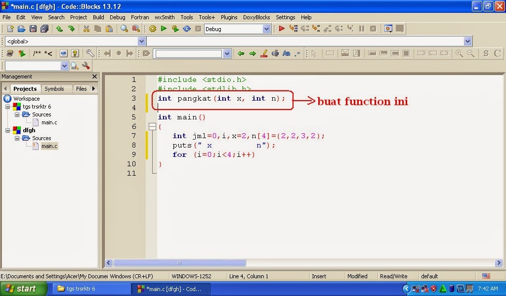 4.selanjutnya kita buat variabel function, seperti biasa ditaruh diatas int main ( ) dan include,